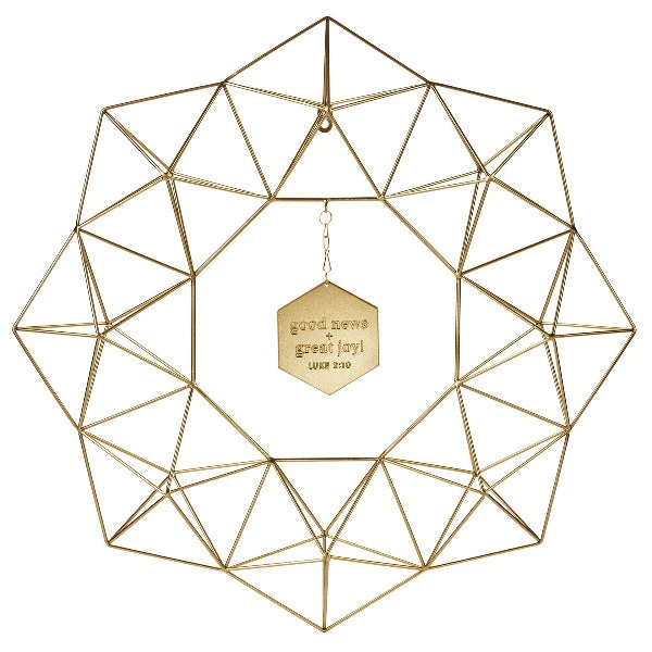 Welcome family and friends with a heartfelt greeting when you display this stylish wreath inside your home. The metal decoration features a striking geometric design with a two-sided charm that wishes a cheerful hello to visitors on one side and shares a spiritual message on the other. Makes a wonderful seasonal decoration and a year-round complement to any decor.