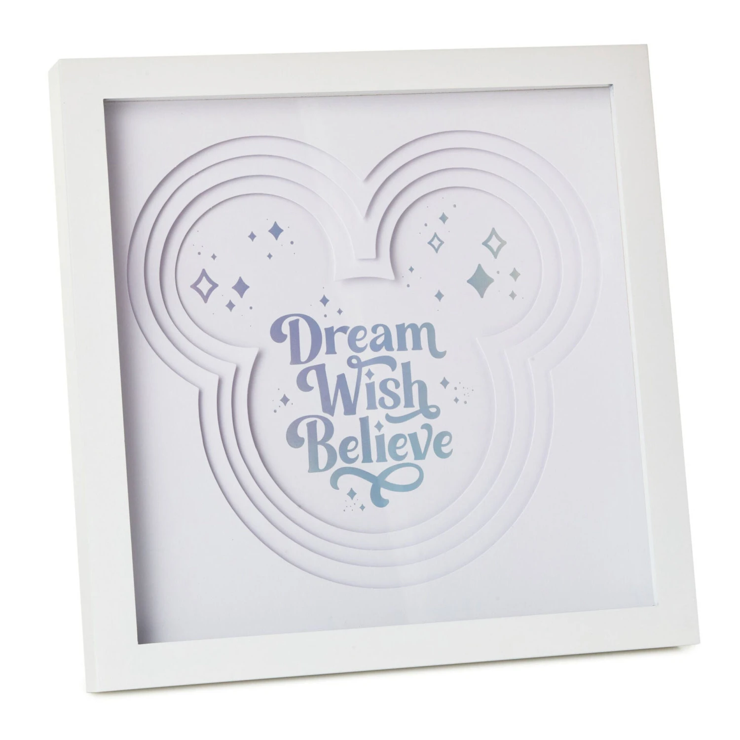 - Disney artwork features a layered paper design of Mickey Mouse ears and an inspirational message in iridescent lettering, finished in a white wooden frame.