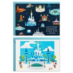 Pop-up birthday greeting card features a three-dimensional, laser-cut design of a glittery pink castle with some of her favorite Disney Princesses: Cinderella, Snow White, Mulan, Rapunzel from “Tangled,” Tiana from “The Princess and the Frog,” Jasmine from “Aladdin,” Belle from “Beauty and the Beast” and Ariel from “The Little Mermaid.” Simply pull down on sides of card and push up on the designed base to pop it open and lock into place for display—no assembly required. When open for display, 3D pop-up card measures approx. 9″ H.