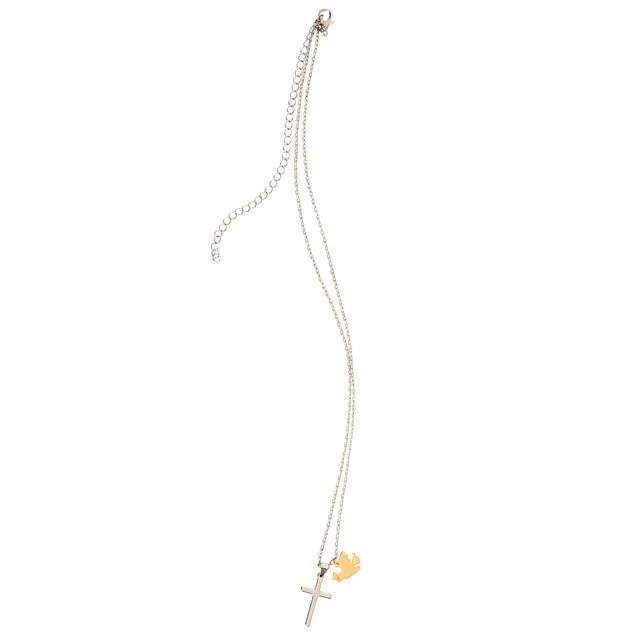 Necklace with cross and dove charm features rhodium plating over brass. Packaged on giftable card with inspirational message.