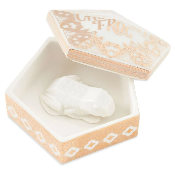 - Harry Potter ceramic trinket box inspired by a Chocolate Frog candy box features ornate gold design with a sculpted frog figurine inside.
