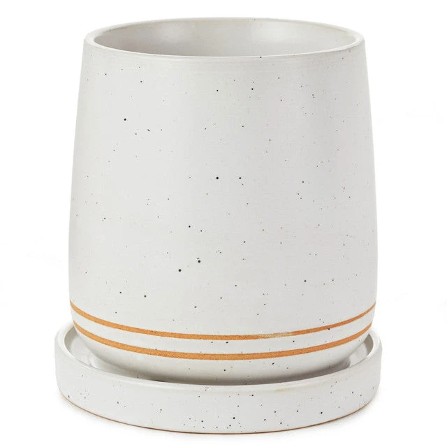 Ceramic planter by Hallmark features a white background flecked with gray, a thin double-line border and raised lip on attached base for water runoff.
